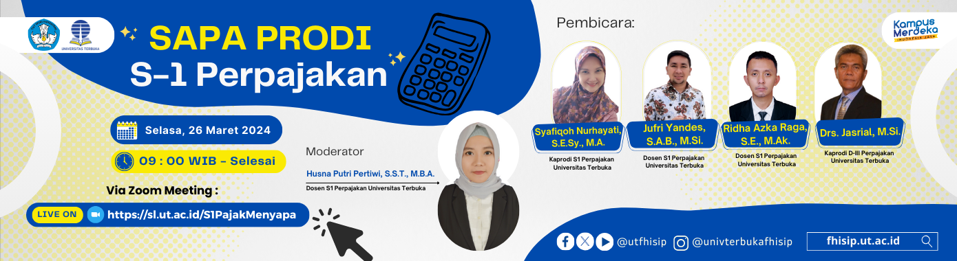 - “Sapa Prodi Baru S1 Perpajakan Universitas Terbuka Bersama Kaprodi dan Dosen S1 Perpajakan” Selasa, 26 Maret 2024 Pukul 09.00 WIB